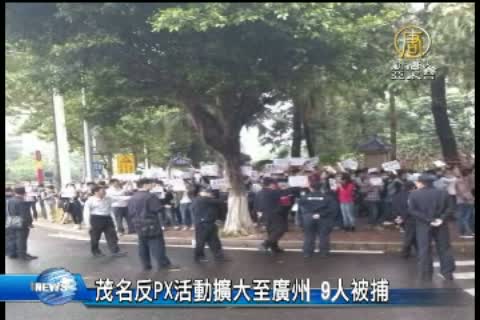 【新唐人亞太台2014年4月2日訊】中國廣東茂名市反對PX項目抗議活動擴大至廣州,1號上午,300多人聚集在省政府門口示威,被警察驅離,9人被捕。在茂名市,目前通往市府的所有路口都被封鎖,防止群眾再次聚集抗議。