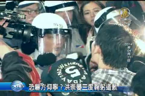 【新唐人亞太台2014年4月15日訊】今天(15日)早上多個團體,在立法院大門口前聲援公投盟,要求立法院開放廣場給陳情民眾。台大學生洪崇晏也到場,由於包圍中正一分局行動,他曾經說,局長方仰寧要小心被暗殺,為此,洪崇晏三度鞠躬道歉。