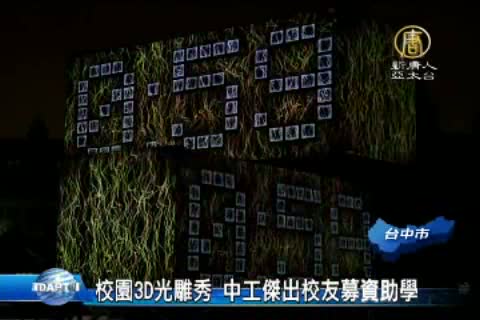 【新唐人亞太台2014年5月11日訊】少子化和12年國教即將上路,各校莫不使出混身解數來招生,技職教育龍頭的台中高工在76周年校慶晚會上,由傑出校友提供3D光雕秀,希望帶動校友踴躍捐款成立獎學金,來吸引優秀學生入學,讓觀看的學弟妹直呼太厲害了,也覺得與有榮焉。