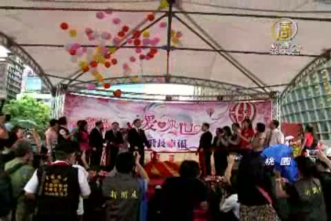【新唐人亞太台2014年6月9日訊】選在2014年中,桃園縣藝文廣場禮拜天舉行一場盛大的集團婚禮,80對的新人在眾人祝福下步入紅毯,新人彼此承諾,婚姻路上,要相愛一世,場面非常溫馨、浪漫。