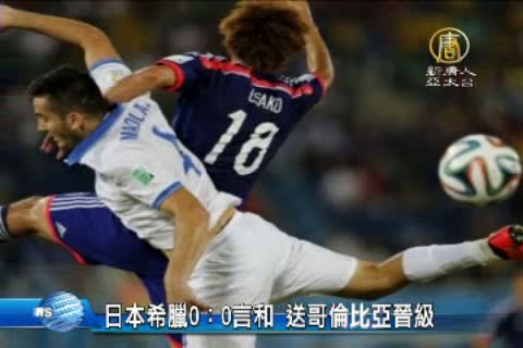 【新唐人亞太台2014年6月20日訊】來關心世足賽事。C組的日本、希臘,在本屆世足首戰雙雙吞敗,因此第二戰兩隊都全力拚勝,可惜最後以0:0平手收場。開賽第12分鐘,日本選手長谷部誠 拉人,吞下黃牌。第26分鐘,希臘隊卡特索拉尼斯 從背後鏟球,吃下黃牌。37分鐘,卡特索拉尼斯又背後鏟球踢倒日本球員,再吃下第二張黃牌出場。希臘10人戰11人,嚴防緊盯日本,終場0:0,讓C組分組第一的哥倫比亞確定晉級。