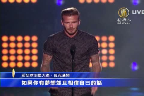 【新唐人亞太台2014年7月19日訊】歡迎回來,足球金童貝克漢在日前,獲得兒童選擇體育獎的傳奇獎,不過,他怎麼也想不到,在領獎台上,會遭遇「突然襲擊」,瞬間變成了一個「金人」。
