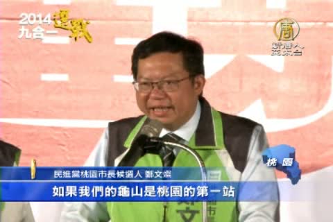 【新唐人亞太台2014年10月4日訊】再來看到桃園的情況,民進黨桃園市候選人鄭文燦,昨晚在龜山成立競選總部,台南市長賴清德特別前來站台,而藍營吳志揚近期則是勤跑文化活動,雙方各自為選戰加溫。