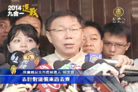 【新唐人亞太台2014年11月5日訊】鏡頭轉回台灣,來看到九合一選舉,台北市長候選人柯文哲辦公室昨天深夜傳出有竊聽疑雲。消息一傳出,柯文哲與連勝文都針對此事做出回應,事情的真相究竟如何,目前警方與中華電信也都還在調查中。