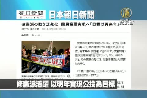 【新唐人亞太台2014年11月12日訊】來看到日本朝日新聞報導:支持修憲的民團正加速行動。保守派團體以明年的參議院選舉為期限,以實現公投修憲為目標。在網路與地方議會,發起連署運動。
