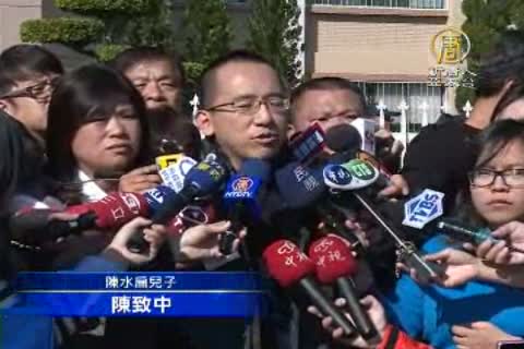 【新唐人亞太台2015年1月5日訊】前總統陳水扁可望在今天保外就醫,支持者一早就在台中監獄外等候,警方不敢大意, 今天也加派人力嚴陣以待。陳水扁的兒子陳致中和前副總統呂秀蓮稍早也前往探視 。