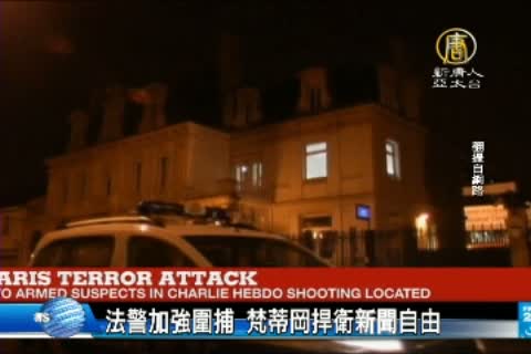 【新唐人亞太台2015年1月9日訊】早安新唐人,馬上帶您看到,法國媒體《查理周報》巴黎辦公室,前天遭3名恐怖份子攻擊,2人持步槍,血洗報社造成12死。目前,1嫌犯投案,2人在逃,警方加緊圍捕,當局加派800軍力駐守巴黎各媒體總部、交通要道、重要建築;而各地則是在昨天傳出清真寺遭攻擊、警察遭射殺等事件,全法國瀰漫緊張氣氛。梵蒂岡發表聲明,強調沒有新聞自由的世界,是恐怖的世界。