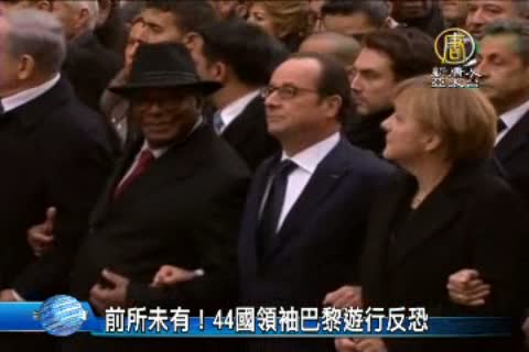 【新唐人亞太台2015年1月12日訊】早安新唐人,帶您看到國際焦點;巴黎反諷週刊《我是查理》遭槍擊血洗後,台北時間昨晚10點,有44國領袖破天荒 齊聚巴黎,參加反恐遊行,而法國全國超過300萬人上街,創下70多年來的記錄。透過畫面看到,就在槍擊案發生第四天,包括法國總統歐蘭德、德國總統梅克爾、英國首相卡麥隆,全都手挽手,走在隊伍第一排,表情嚴肅,而前所未有的大團結畫面還有,以色列總理尼坦雅胡和巴勒斯坦自治政府主席阿巴斯一起打頭陣,烏克蘭總統波羅申科和俄羅斯外長拉夫羅夫也共同出席。法國全國周日有超過300萬人遊行,反對恐怖主義,悼念死難者