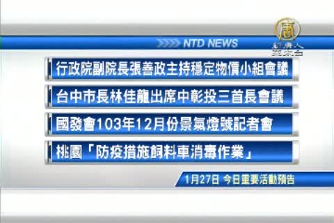 【新唐人亞太台2015年1月27日訊】接著看到,今天,一月27日,星期二,有哪些重要活動,行政院副院長張善政主持穩定物價小組會議,台中市長林佳龍出席中彰投三首長會議,財經方面,國發會將公布去年12月份景氣燈號,另外,桃園飼料廠將舉行「防疫措施飼料車消毒作業」。
