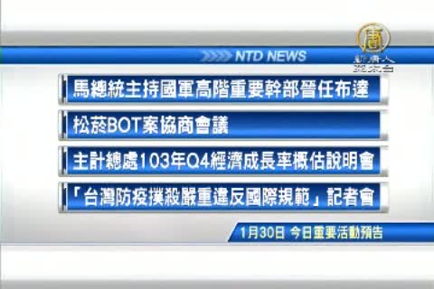 【新唐人亞太台2015年1月30日訊】接著看到,今天,一月30日,星期五,有哪些重要活動,總統馬英九主持國軍高階重要幹部晉任布達授階典禮,下午,台北市政府舉行松菸BOT案協商會議,財經方面,主計總處公布今年第四季經濟成長率概估,另外,民進黨立委記者會,批評「台灣防疫撲殺違反國際規範」。