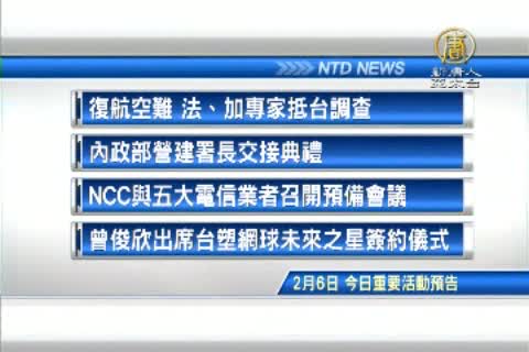 【新唐人亞太台2015年2月6日訊】接著看到,今天,二月6日,星期五,有哪些重要活動,法國、加拿大專家抵台,參與復航空難事故調查。內政部營建署長交接典禮。下午,NCC邀請五大電信業者,就4G相關管理規則「預備聽證會」先做議題溝通。以及,網球小將曾俊欣,出席台塑網球未來之星簽約儀式。