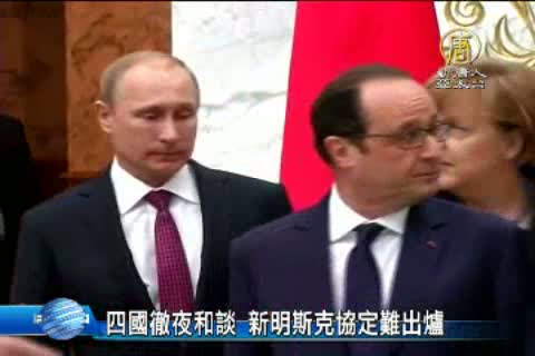 【新唐人亞太台2015年2月12日訊】關心已經奪走5000條人命的烏東戰火,禮拜三,法國、德國、烏克蘭和俄羅斯,舉行四國調停會談,但目前,還沒有進一步的結果出爐。德國總理梅克爾、法國總統歐蘭德、烏克蘭總統波羅申科以及俄羅斯總統蒲亭,周三晚間在明斯克進行會談,但直到深夜,仍然沒有具體結果。之前蒲亭曾向西方國家提出要求,重新界定去年9月明斯克協定中的停火區,並在烏克蘭設立更多自治區,作為實現停火的條件。不過,波羅申科也已經明確表示,不會讓出更多國土。