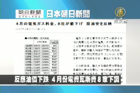 【新唐人亞太台2015年2月27日訊】來看到日本朝日新聞報導:反應油價下跌 4月份電費瓦斯費8家下調
