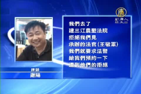【新唐人亞太台 2015 年 03 月 04 日訊】繼續關心,受到海外關注的建三江案,張維玉等兩6名律師,日前成功會見了當事人法輪功學員,不過,他們要求見承辦法官時,卻遭到拒絕,對此,昨天他們前往哈爾濱正式提告,我們記者採訪到了中國律師,為我們還原實況。