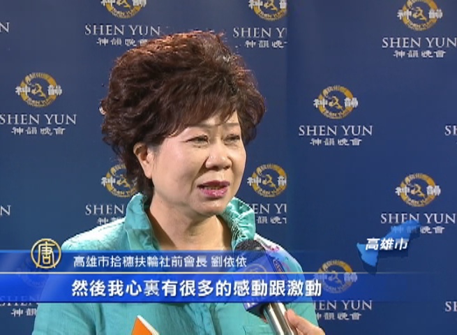 高雄市拾穗扶輪社前會長 劉依依:「我看到台上每一位表演者她們的服裝豪華亮麗然後那種生動,實在歎為觀止,而且尤其是她們的布景跟那個科技跟電腦拍攝的結合(動態天幕),實在讓 我非常非常的感動,整齊劃一的舞蹈還有她們那種結合中國幾千年來的那種文化,藝術把他融合在一起,我真的是為我們是身為中國人感到非常的驕傲,非常的棒, 真的讓我真的非常難忘,那我回去一定會再介紹更多的朋友一定要來觀賞神韻,真的太棒、太美、太好了。」