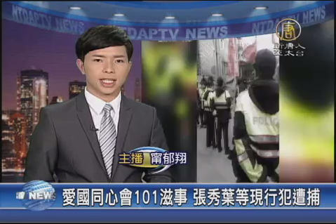 【新唐人亞太台 2015 年 03 月 06 日訊】愛國同心會在101大樓前宣揚中共、攻擊謾罵法輪功學員的事件,遭到抨擊,就在新的信義分局局長上任後,今天愛國同心會成員又在現場滋事叫囂要打人,並且攻擊警察,最後包括張秀葉等2女1男,被以現行犯身分,遭到逮捕。