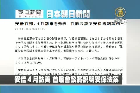 【新唐人亞太台 2015 年 03 月 24 日訊】來看到日本朝日新聞報導:安倍4月訪美 首腦會談將說明安保法案