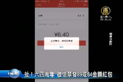【新唐人亞太台 2015 年 06 月 04 日訊】今天是六四26週年,然而北京風聲鶴唳,不僅嚴控維權人士,禁止外媒到天安門採訪,對於,通訊軟體也加強封鎖。 有港媒做測試發現,微信WeChat支付的小額付款,不能含有89、64等字眼,如果,想要匯出89.64元,就被WeChat告知「交易失敗,請稍候再試」;再測試8.90元、0.64元的紅包,也全部無法成功。外界認為,當局可能是擔心民眾藉由發送紅包,來紀念六四。