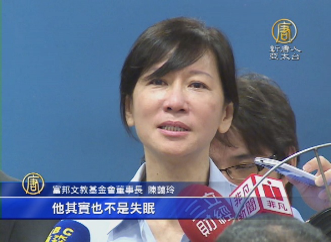【新唐人亞太台 2015 年 06 月 08 日訊】富邦金控董事長蔡明忠,今天出席和法國合作的電影學校計劃記者會。不過媒體最關心的,還是富邦和台北市府談判文創大樓的進度。至於台北市長柯文哲之前爆料,蔡明忠晚上睡不好,夫人陳藹玲則笑著回應,蔡明忠都靠運動減壓,現在狀況好多了。