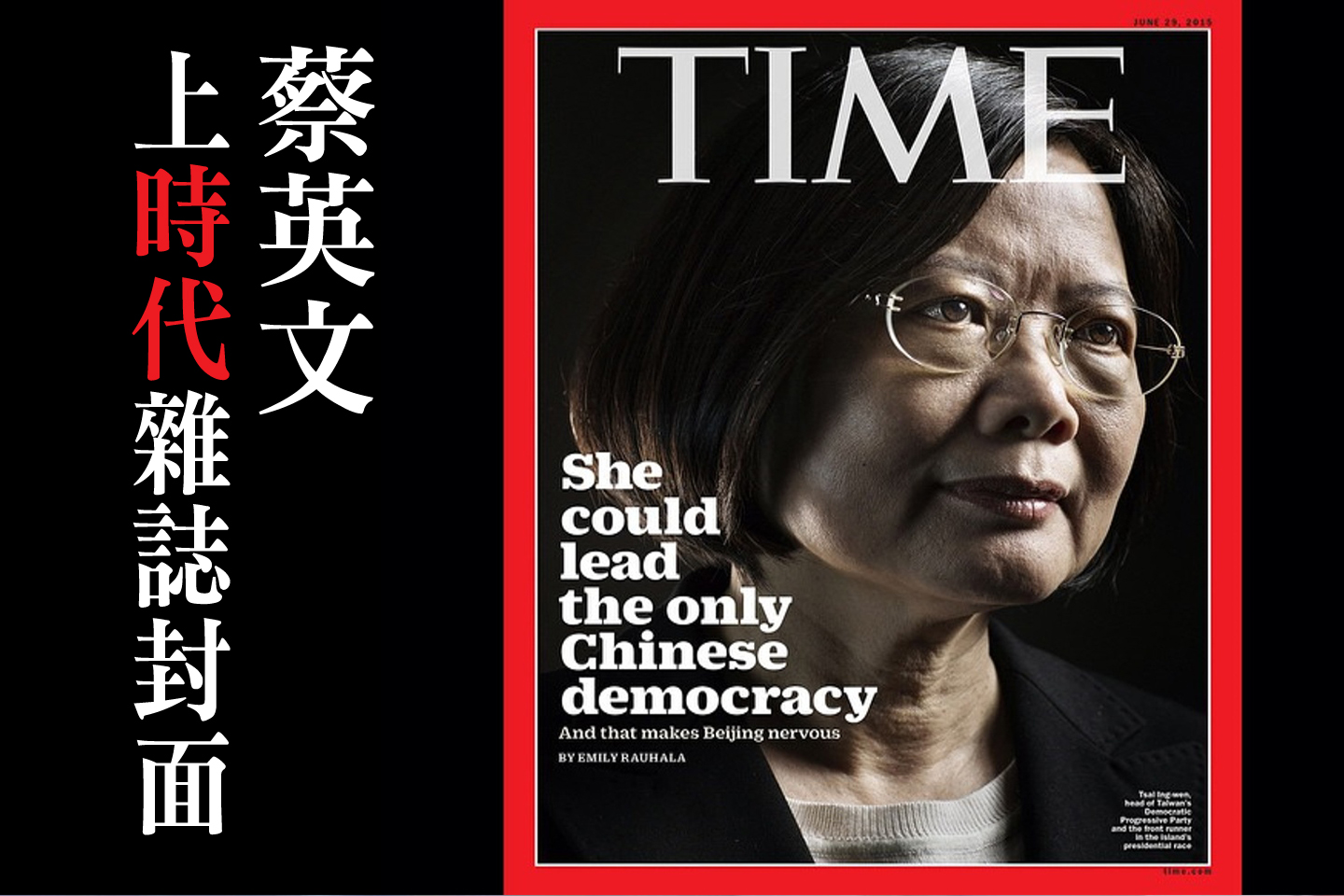【新唐人亞太台 2015 年 06 月 19 日訊】接著看到,台灣2016總統大選,也受到外媒關注,29日將出刊的《時代雜誌》亞洲版,專訪台灣民進黨總統參選人蔡英文,並以她為封面人物,標題寫下「她可能領導唯一華人民主,這讓北京開始緊張」,稍早,蔡英文也對此作出回應。