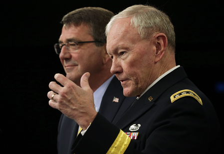 美國國防部長卡特(左)和參謀長聯席會議主席馬丁‧登普西(右)聯袂參加7月1日在五角大廈2015年《國家軍事戰略》報告記者會。(Alex Wong/Getty Images)