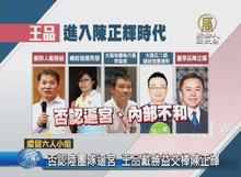 2015-07-23 13:04:13財經消息,王品集團,為了平息外界對「逼宮」、「內鬥」的多種各種猜測,提前在今天上午 召開臨時董事會,選出陳正輝為新任董事長,我們請前線記者沈唯同 告訴我們最新情況。唯同。