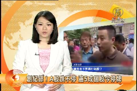 【新唐人亞太台 2015 年 07 月 08 日訊】中國股市更是慘跌。到昨天晚上為止,已經有超過660家上市公司申請今天停牌,如果再加上前幾天申請的家數,今天,中國股市有超過1千429家上市公司股票停牌;滬深兩市停牌股票占比將超過51%。這樣的停牌規模也創下中國金融史上的新紀錄。