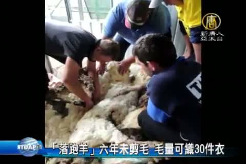 【新唐人亞太台 2015 年 09 月 04 日訊】去澳洲旅遊經常會看到剪羊毛表演。通常一隻綿羊一年都要剪一次羊毛,但坎培拉郊區的有一隻綿羊「克里斯」,走失了六年,沒剪過羊毛,毛量已經澎到牠走不動了。被人發現後幫牠剪毛,居然剪下42公斤重的毛量,可以織30件毛衣。