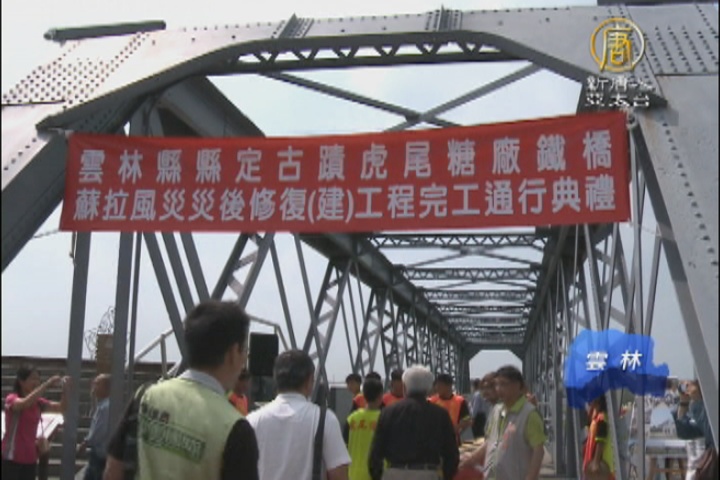 【新唐人亞太台 2015 年 09 月 10 日訊】雲林縣的縣定古蹟虎尾糖廠鐵橋,三年前蘇拉颱風來襲,約有五十公尺橋面遭到大水沖毀。為了修復鐵橋,文化部文資局、雲林縣政府以及民間業者合作,受損三年的鐵橋修復完成,重新開放民眾遊客遊憩使用。