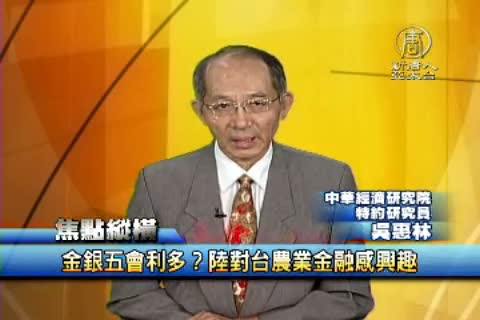 【新唐人亞太台 2015 年 09 月 15 日訊】中國銀監會主席尚福林來台,參加兩岸金銀五會,會上兩方決定要研議,擴大兩岸金融業相互參股,放寬在中國的同省異地分行條件,等等都被認為,可能會加速,台灣的國銀布局大陸的速度,另外,尚福林還點名,對台灣的農業金融感興趣,他想進一步了解。怎麼解讀,今天的焦點縱橫,為您解析。