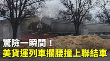 驚險一瞬間!美貨運列車攔腰撞上聯結車