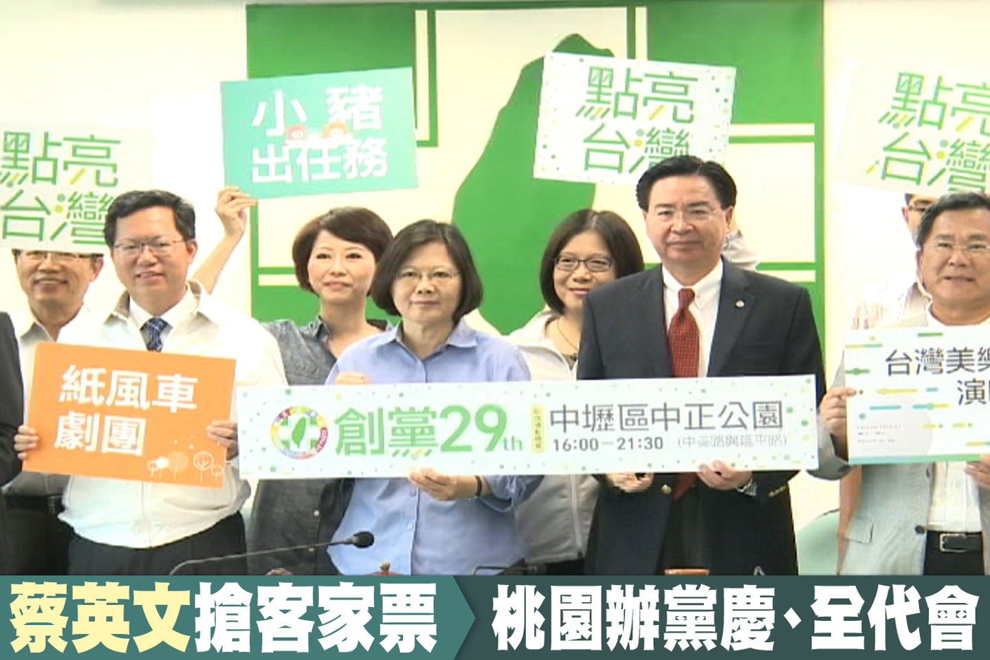 民進黨主席蔡英文率領中常委,替週末的黨慶及全代會造勢。地點選在桃園,19日當天下午,先在平鎮圖書館舉辦全代會,替總統、立委選舉造勢。下午到晚間,在中壢中正公園舉辦黨慶。上回總統大選,蔡英文在桃園大輸20萬票,這回在桃園造勢,搶攻客家選票意味濃厚。