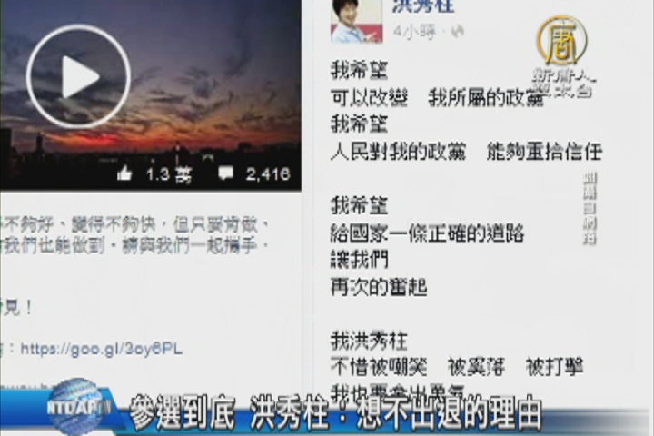【新唐人亞太台 2015 年 10 月 06 日訊】繼續來關心2016選舉,面對黨內換柱聲浪,原本國民黨總統參選人洪秀柱今天下午2點在立法院主持院會前,將向媒體說明她的動向,不過,現在看來,她參選心意是相當堅決了。 因為稍早她接受中央社記者的電話採訪,就透露 她會參選到底,洪秀柱說,她目前想不出可以退的理由。對於黨中央打算修黨章撤換提名,她表示,不能接受「因人設事」。而繼昨晚 在臉書撂下重話,說國民黨如果啟動換柱,黨的誠信 蕩然無存之後,上午她又在臉書發文,說自己,不惜被奚落,也希望改變 國民黨。