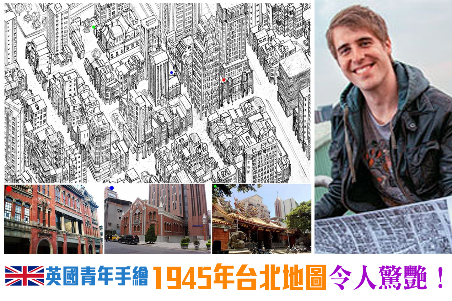 【新唐人亞太台 2015 年 10 月 13 日訊】帶您看到,1945年的老台北 手繪地圖,不過作者是出自於一位英國年輕設計師,英國人湯姆‧魯克 目前居住在台灣,他在臉書放置自己繪製的作品,其中多是城市和建築意象。他表示,自己因為被老台北照片中的美所吸引,同時為今非昔比而感傷,竟引發了不可思議的鄉愁,所以開始繪製以前的台北地圖。