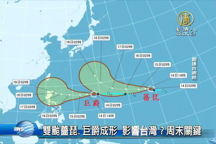 【新唐人亞太台 2015 年 10 月 14 日訊】午報頭條帶您看到,又有雙颱成形,氣象局表示,今天(14日)清晨2點,西北太平洋上有輕度颱風「薔琵」形成,以每小時20公里速度,向日本東方海面前進,影響台灣機率不高。另一方面,昨晚(13日)8點生成的輕颱「巨爵」,將會先偏西,接近菲律賓東方海面,未來有逐漸轉北的趨勢,如果,北轉時間較晚,將可能影響台灣,關鍵時間就在本周末。