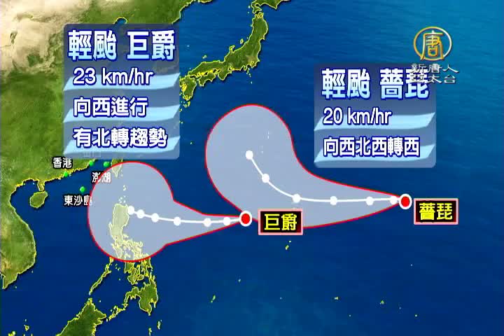 【新唐人亞太台 2015 年 10 月 14 日訊】又有雙颱出現!繼昨晚(13日)輕颱巨爵先形成,今天凌晨又有一個輕颱 薔琵 加入,但距離台灣較遠,影響不大,倒是現在正朝西往菲律賓前進的巨爵,有北轉的可能,如果靠近菲律賓時才北轉,將影響台灣!氣象局說,關鍵就在週末,但週五(16日)東北季風以及外圍環流就會在北部帶來降雨。