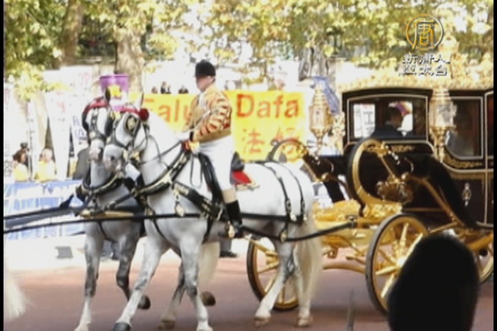 【新唐人亞太台 2015 年 10 月 21 日訊】習近平訪問英國的第一天,在英國國會發表演說,他談到中國古人對於民主和法制的觀念。接著出席國會晚宴。而當天中午,英國女王和習近平同乘一輛馬車,經過法輪功學員和平請願,王室三代成員的座車都隨後跟上,據說威廉王子還專注地看向路旁「法輪大法好」和「法辦江澤民」的標語,並向法輪功學員微笑招手致意。