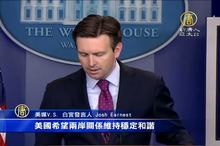 美媒 V.S. 白宮發言人厄尼斯特( Josh Earnest ):「(台灣的總統和中國國家主席7日要在新加坡會面,這是1949年以來兩岸領導人首度會面,白宮對此有何期待?會覺得這是一個轉捩點嗎?) 我覺得現在要說些什麼還言之過早。美國希望兩岸關係維持穩定和諧,美方也會秉持「美中三公報」及「台灣關係法」的「一個中國」政策,所以,我們當然歡迎海峽兩岸為降低緊張和改善兩岸關係所採取的行動,但我們必須得看會談的實際結果。」