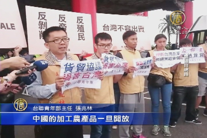 【新唐人亞太台 2015 年 11 月 21 日訊】再來看到,爭議中上路的,第12輪兩岸貨品貿易談判,今天上午在圓山飯店登場,台聯與民團前往抗議,質疑兩岸監督機制尚未確立,兩岸談判形同黑箱作業,更憂心貨貿加速中國農產品輸台,衝擊民眾生計。