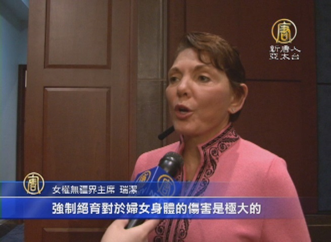 女權無疆界主席 Reggie Littlejohn:「婦女不敢生第二胎,是因為害怕被強制絕育。在我們調查的區域是這樣的,我想可能大部份中國農村地區也是這種情況:當你有了第二個孩子以後,即使是符合政策的,你也可能被強制絕育。強制絕育對於婦女身體的傷害是極大的。」
