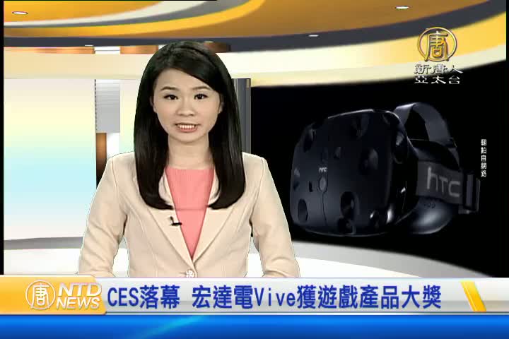 【新唐人亞太台 2016 年 01 月 11 日訊】美國消費性電子展CES落幕,今年總計約有3600家廠商發表創新新品,台灣也有許多廠商參展,手機大廠宏達電的虛擬實境眼鏡Vive,今年拿下最佳遊戲產品大獎。