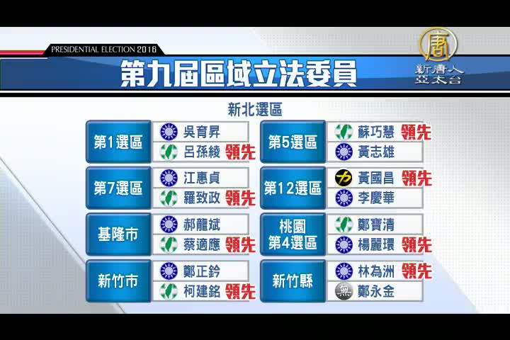 【新唐人亞太台 2016 年 01 月 16 日訊】歡迎回到新唐人選戰之夜,來看到新北市幾個膠著選區。目前的情況,國民黨幾乎是一片落後。新北第1選區 民進黨呂孫綾 領先國民黨吳育昇,第5選區 民進黨蘇巧慧 領先國民黨黃志雄,第7選區 民進黨羅致政 領先國民黨江惠貞 ,新北第12選區 時代力量黃國昌 領先國民黨現任立委 李慶華。