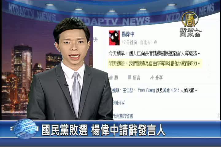 【新唐人亞太台 2016 年 01 月 16 日訊】國民黨總統大選與立委選選情不如預期,第三勢力出身的國民黨發言人楊偉中稍早在臉書上宣布,已經請辭國民黨發言人等職務。楊偉中也呼籲,「明天過後,我們繼續為自由平等幸福的台灣而努力」。