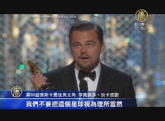 【新唐人亞太台 2016 年 03 月 01 日訊】等了23年,李奧納多狄卡皮歐終於拿下第一座奧斯卡獎,他的得獎感言除了感謝團隊外,還呼籲大眾關注環保議題,他的得獎感言影片,也在網路上被瘋狂轉載。