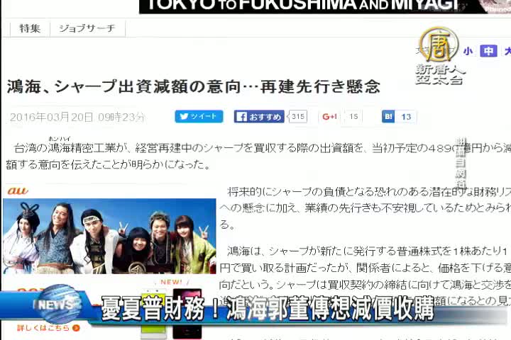 【新唐人亞太台 2016 年 03 月 20 日訊】財經消息,再來關心,鴻夏戀進展,日本《讀賣新聞》今天報導,因為夏普的潛在負債和未來獲利令人擔憂,鴻海正尋求削減收購夏普的價碼,可能從原本的每股118日圓調降;原本總金額為 4890億日圓,之後可能會減少一成到兩成。