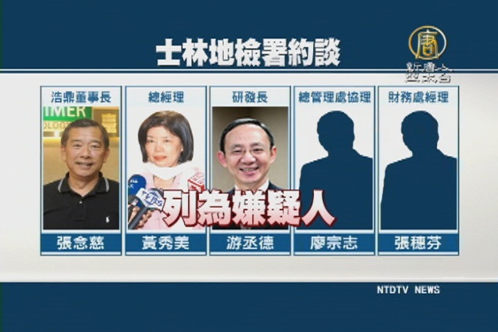 而士林地檢署也在今天展開搜索、約談行動,其中,浩鼎董事長張念慈、總經理黃秀美、研發長游丞德、總管理處協理廖宗志、財務處經理張穗芬等5人,被列為嫌疑人。