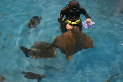 穿著潛水衣的專業飼育人員,每天都會進行水下餵食活動。館方強調,在餵食魟魚活動中,這群美麗魚類更會主動靠近飼育人員討食,成為吸睛亮點。而在這美麗的背後,飼育人員需要費一番功夫用心照護,生物需要定期的接受健康檢查,若有感染寄生蟲則須隔離至後場進行治療,檢疫後重新回到展缸中生活。