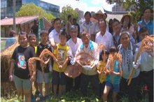 新瓦屋客家文化保存區,「2016耕讀生活趣」系列活動即將開跑。新竹縣長邱鏡淳(左五)和客委會副主委范佐銘(右四),邀請民眾一起體驗農耕的樂趣。(新唐人亞太電視記者 林秋霞攝)
