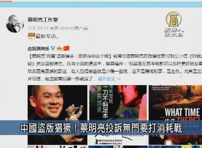 台灣資深金馬導演蔡明亮,近來飽受中國盜版商的侵擾,先後在網路上發現自己沒有授權的影片,不僅對他侵權,也損及作品品質。蔡明亮多次向中共版權局反映,都得不到解決。他並揚言,要與盜版商打一場消耗戰,堅持揪出不法元兇。