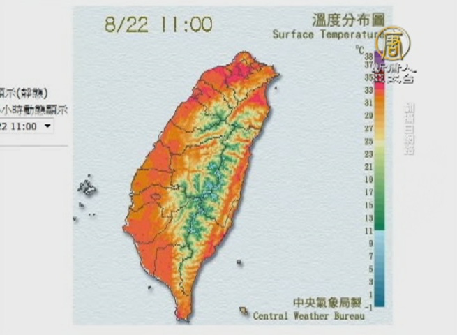 【新唐人亞太台 2016 年 08 月 22 日訊】來關心天氣,氣象局指出,今天白天水汽減少,就在上午11點半,台北已經出現35.8度高溫。氣象局提醒,今天紫外線指數容易達到「過量」或「危險」等級,觀眾朋友外出時請記得做好防曬措施,補充水分避免中暑;而中午過後,各地山區及嘉義以南降雨機率較高,也請民眾注意短暫雷陣雨。